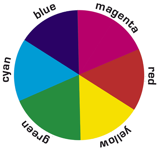 Instead of trying to identify a cast from six possible colors, you can halve the possibilities by determining whether the cast is warm or cool. On our color wheel, the warm colors are at the right of the vertical axis (magenta, red and yellow) and the cool colors are at the left of the axis (green, cyan and blue).