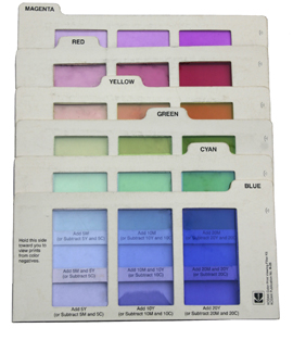 It may be difficult at first to distinguish the difference between colors, especially between red and magenta, between cyan and blue or between yellow and green. Colored viewing filters are filters sold in kits with one filter for each of the primary additive and subtractive colors. Each filter has three windows, each with a different strength of that hue. When printing color negatives, always hold the white side of the filter card toward you to view the print. Looking at a print (especially white areas of a photograph or a corrected print) through colored viewing filters will help you to see what each color looks like as a cast.