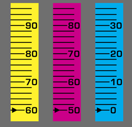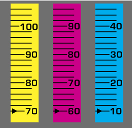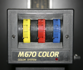 In Making a Color Enlargement, we recommended setting the cyan to 0, the magenta to 50 and the yellow to 60 before making the test and trial prints. We chose these settings because one of the three subtractive colors must be set to 0 in order to avoid neutral density. Neutral density is gray light resulting from equal quantities of cyan, magenta and yellow light. For example, in the illustration to the left (cyan: 10; magenta: 60; yellow: 70), the lowest common denominator (in this case, 10 points) produces gray light that does not affect the color but does increase the required exposure time (as you increase filtration, you must increase exposure to maintain the same density).