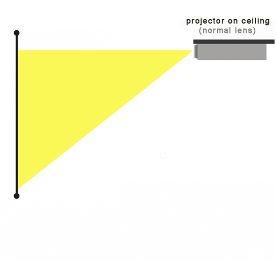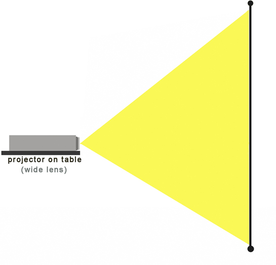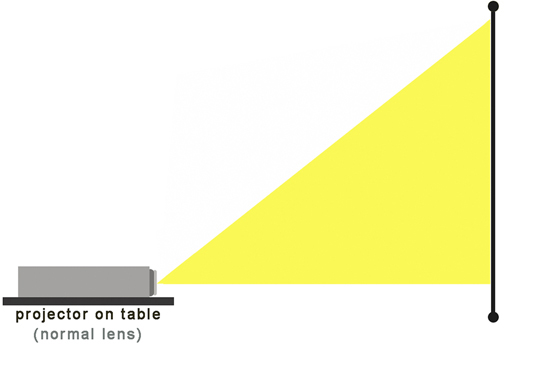 Most slide and overhead projectors project a wide beam and so should be positioned at a height approximately half the height of the screen (See illustration projector wide/table). Most digital projectors are tabletop projectors. Because they are designed to project their beam from a conference table, optics are designed to reach a screen that will be higher than the projector (See illustration projector normal/table.). If your installation needs demand a different orientation of beam, you can change the beam by widening the lens’ focal length with a zoom lens or an interchangeable lens. Many digital projectors can also be installed from a ceiling; in this case, the beam is reversed and angles downward. (See illustration projector normal/ceiling.) Most digital projectors also allow for rear projection, when using a translucent screen. In this case, the electronic controls will reverse the image. If the image is not reversed electronically (or in previous editing), it would be seen backwards. The most important thing is to make sure you have the right relationship between the projector and the projection surface.