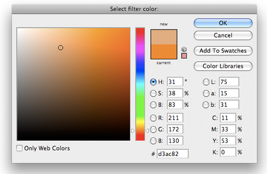 To choose a filter color, it is sometimes easier to first identify the color of the cast and then invert that color to pinpoint the filter color. To do so, click on the color that resembles the cast in the Color Picker panel. In our example, we’ve selected a cream color that resembles the cast.