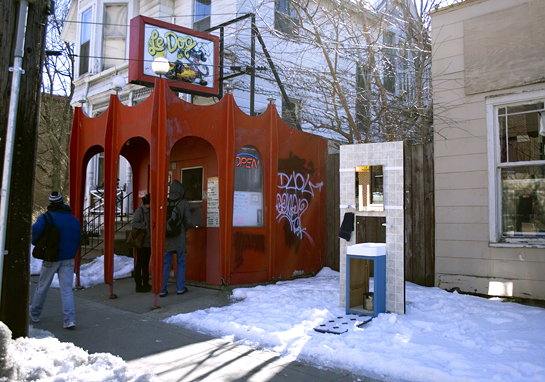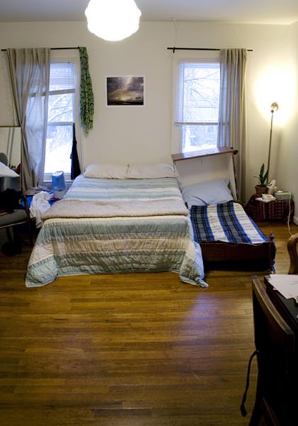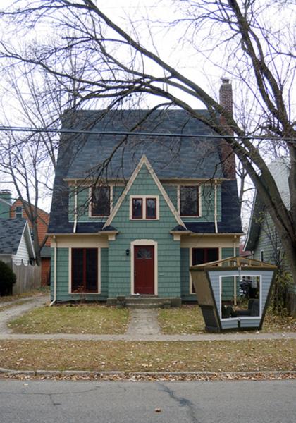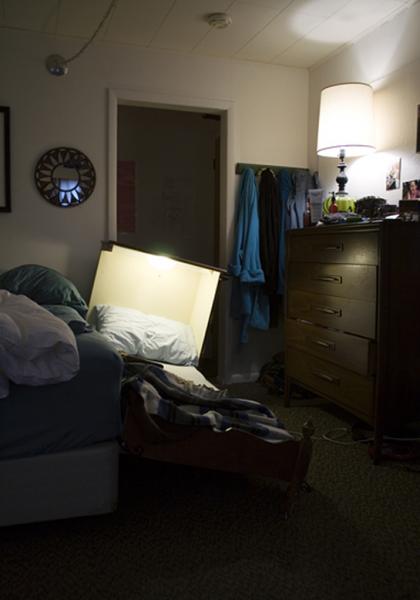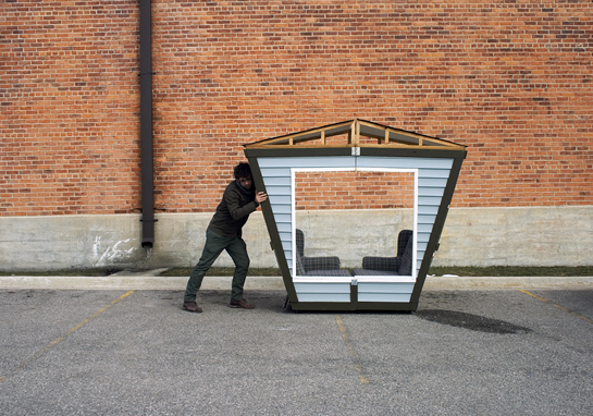Make/Shift is a series of architectural sculptures and photographs addressing displacement and the geography of home. These nomadic devices, assembled from salvaged furniture and construction materials, were built out of my desire to carry home with me as I move from place to place. Each of them addresses the precarious border between interior and exterior, between intimacy and estrangement. The objects have been installed in various locations outside of the gallery and documented. These accompanying photographs narrate their migrations and the longing for home.