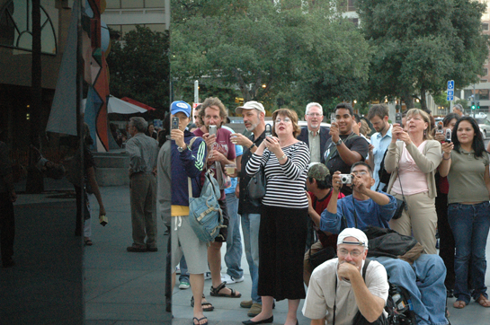 The project asks members of three communities that make up San Jose’s labor needs—Silicon Valley’s tech workers, undocumented service workers and outsourced call center workers—one question: What is the fruit of your labor? Their responses are displayed back to the general public on a 4 8ft. infrared LED screen whose content is visible only through the audience’s personal digital capture devices (cellphone cameras, digital cameras and DV cams etc.). By creating this hidden/mediated spectacle, we knew we could generate the right amount of curiosity and reward…[to encourage the crowd] to partake in its ‘viewing’. Part of the consequence of this engagement was that some people could completely view the work, while others shared or looked over shoulders in efforts to understand what