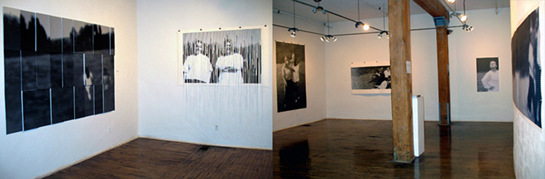 Traci Molloy, Tomorrow I Might Forget, 2006, digital print on paper, 4’x6′.The paper strips cascading in front of this print are the result of incisions made into the paper. The strips extend outward from the wall about two feet.