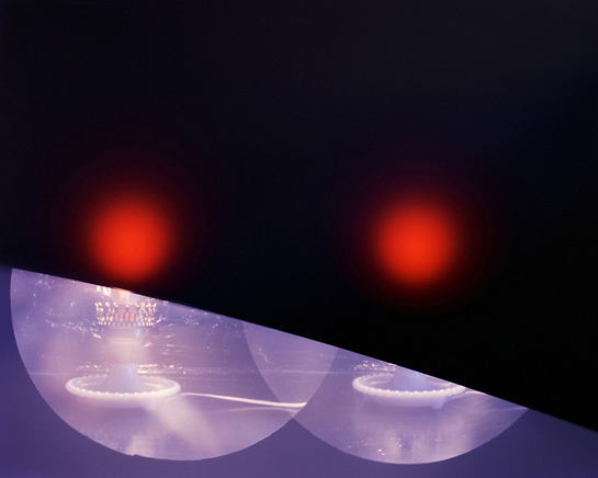 To this end, my investigation has yielded box cameras with multiple apertures, cameras with objects placed between the aperture & the film plane such as a magnifying glass or light bulb, and cameras where the film holder is placed perpendicular to the aperture or is otherwise skewed. Since each device is unique, exposure time is also variable. As noted in the image title, I make exposures ranging from several seconds to several hours and at different times of day. The resulting images are truly unpredictable and taken as a whole, the series documents the potential of photographic material and the agency of light.