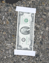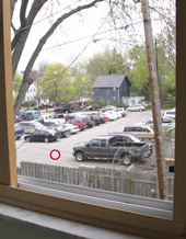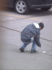R. Modrak. After having my first child, I spent a lot of time while nursing staring out of my window into the parking lot below and exercising my memory by tracking which people belonged to which cars. To further my interest in the lot, I experimented with the camera-binoculars by taping money in place and then tracking responses. This guy picking up the bill (third picture) is the ninth person who saw it, but the first to pick it up.