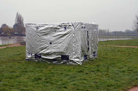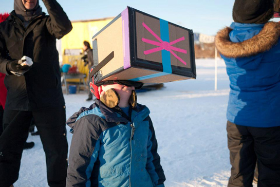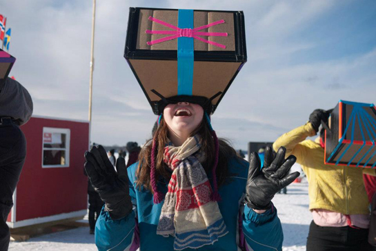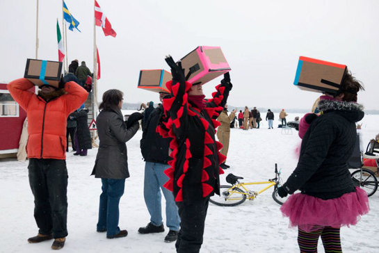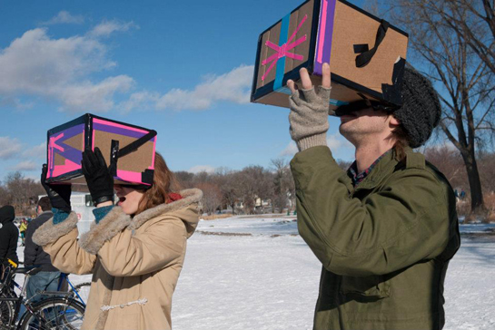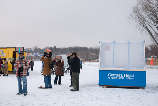 Andy Mattern and the Camera Head team (Joe Kaercher, Mark Kritz, and Brady McClaran) created the Camera Head Shanty at Art Shanty Projects on Medicine Lake, Minnesota. Their mobile laboratory gave participants the opportunity to view the lake and fishing houses behind them via a camera obscura worn over their heads. Their tricked out version of the Reframing Photo portable camera obscura design (pages 52 – 53 in the book) includes a headstrap and pinstriping.