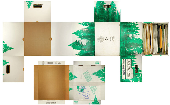 From July 15 to August 15, 2009, I took part in an artist project in Montreal, where 5 artists were invited to discuss and make work from the programming archives of an artist-run centre (Centre des arts actuels Skol). During its duration, the actual structures or containers intrigued me — the physical boxes holding the archive and the various architectural spaces that the centre had occupied over its history; it had moved 5 times.The piece I included in the final exhibition of our investigations was a one-to-one scale photograph compiled of all the sides (inside and outside views) of one of the programming boxes, mounted on the gallery floor. (excerpt from artist’s statement)
