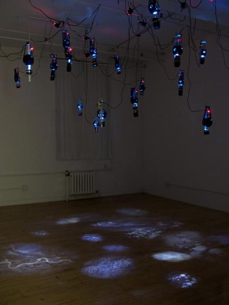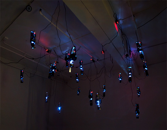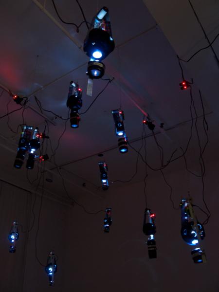Owen Mundy, You Never Close Your Eyes Anymore, aluminum, glass, motors, electronic components, LEDs, satellite photographs, 20′ x 20′ x 15′, 2010