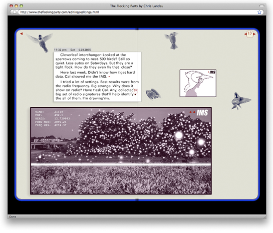 Screen shot of page 13 of Chris Landau’s web-based work, The Flocking Party, 2005, Flash and Photoshop. http://www.theflockingparty.com/