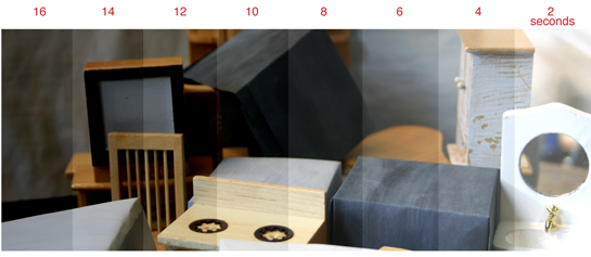 Hold an opaque board an inch above the paper, shielding all but a 1” section. Press the timer button to trigger the enlarger light. Keep the board still while the paper is exposed for 2 or 3 seconds. When the light goes off, do NOT remove the paper, but move the opaque board to reveal another two inches of the paper. Press the timer button again. Continue this series of actions until the entire strip of paper has been gradually exposed. For example, if you made eight 3-second exposures on the strip, the print will have eight areas of differing density in 1” increments from 3 to 24 seconds. The ideal final exposure should be between 12 and 20 seconds as a minimum of 12 seconds will give time to dodge and burn. More than 20 seconds is unnecessarily long.