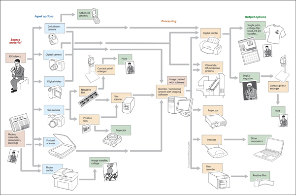 Reproductive Processes invites you to think of photography as the act of reproduction, which may involve making records on film and digital media, or generating copies of images through rubbings, needlepoint, or other materials. Images can be malleable and transferrable. The following illustration recognizes some options for capturing, processing, and reproducing images and acknowledges the elasticity possible in rendering and duplicating a subject’s image.