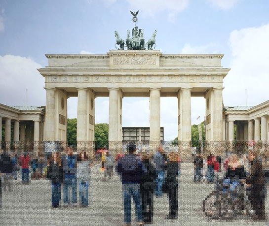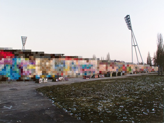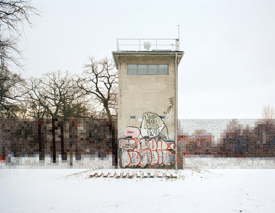 These embroidered images are from a series of photographs taken along the entire circumference of the former Berlin Wall. Sections of the photographs have been obscured by cross-stitch embroidery sewn directly into the photograph forming a pixelated version of the underlying image. My retracing of the Wall perimeter took me through the city center as well as the suburbs and outlying forests. I was particularly interested in photographing locations where no visible traces of the actual wall remain, but in which there are subtle clues of its previous existence. These clues include incongruities in the architecture that occurred as new structures were built on newly opened land parcels, changes in street lights or newer vegetation. In addition to the physical aspects that point to the former division of the city, I am interested in the psychological weight of these sites. In many of the images, the embroidered sections of the photograph represent the exact scale and location of the former Wall offering a pixelated view of what lies behind. In this way, the embroidery becomes a trace in the landscape of something that no longer exists, but is a weight on history and memory.