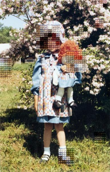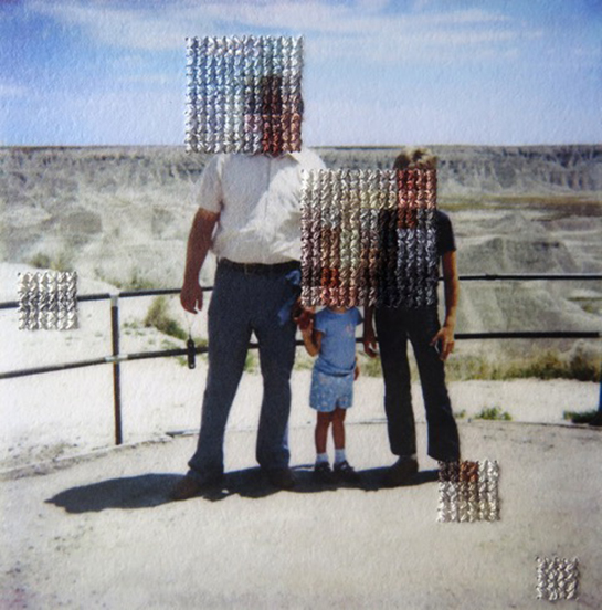 In series Time Spent That Might Otherwise Be Forgotten, cross stitch embroidery has been sewn directly into family photographs. The images are broken down and reformed through the embroidery into a hand-sewn pixel structure. As areas of the image are concealed by the embroidery, small, seemingly trivial details emerge while the larger picture and context are erased. I am interested in the disjunct between actual experience and photographic representation and photography’s ability to supplant memory. By borrowing the visual language of digital imaging with an analog process, a connection is made between forgetting and digital file corruption. The tactility of the pieces also references the growing trend of photos remaining primarily digital- stored on cell phones and hard drives, but rarely printed out into a tangible object.