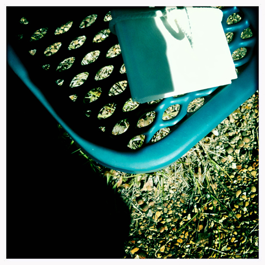 on the corner of a blue picnic bench. The preview, transit, and installation photos will remain on my Facebook photo archive as an online record of the work.