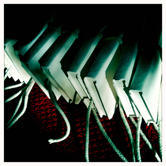 MVC. Almost 2/3 of the books had disappeared completely. Most of the remaining books had been relocated and rearranged into new mini-installations. One book had been broken and put back together like a puzzle. Only a single book was still in its original location –