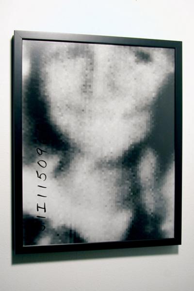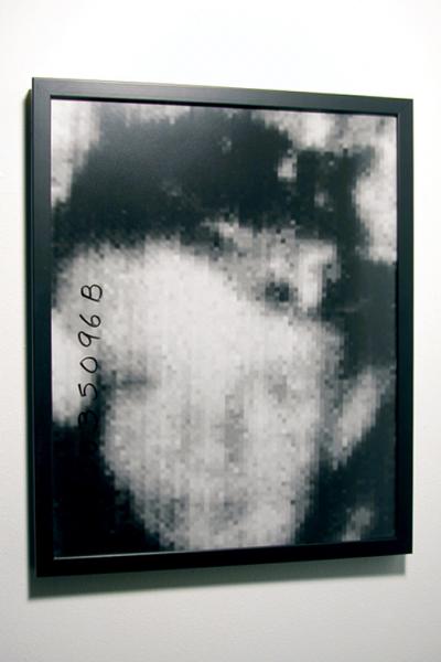 A vintage 4×5´´class photo has been repeatedly enlarged, cropped, and re-photographed several times using a variety of cameras. The final images shown here reveal the effects of digitization from a large-pixel toy video camera and projection onto the television screen. The faces are at least ten degrees of separation from the originals, yet each retains recognizable features of a unique individual. Each print is overlaid with a hand-written alphanumeric code.